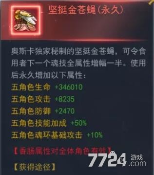 奥斯卡独家秘制的坚挺金苍蝇,可令使用者下一个魂技全属性增幅一半,使用后永久增加以下属性